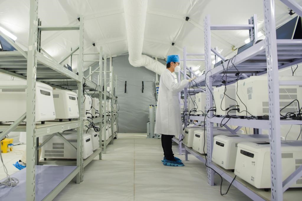12月3日,工作人員在“獵鷹號”硬氣膜實驗室進行核酸檢測。新華社記者達日罕 攝