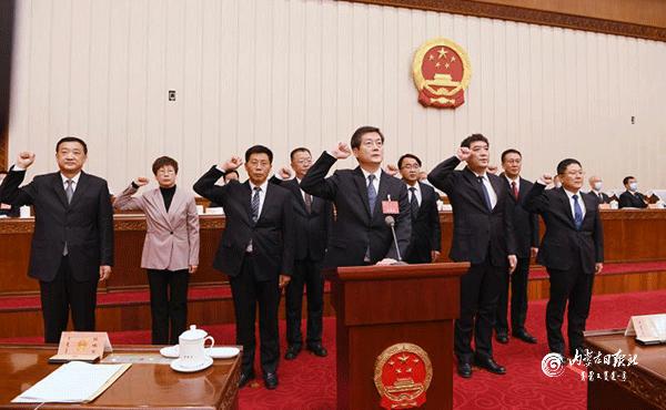 12月14日上午,自治區(qū)十三屆人大常委會第三十二次會議舉行了憲法宣誓儀式。自治區(qū)黨委書記、人大常委會主任石泰峰主持并監(jiān)誓。圖為新任職人員在依法進行憲法宣誓。 內(nèi)蒙古日報社融媒體記者 袁永紅 攝