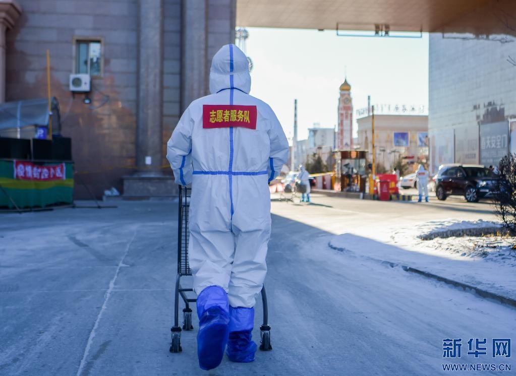 12月5日,在滿洲里市尚都國(guó)際小區(qū),志愿者為居民送物資。新華社記者 李志鵬攝