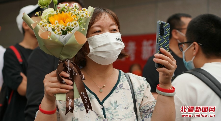 6月8日下午5時(shí)30分,呼和浩特市第二中學(xué)考點(diǎn)外站滿了考生親屬、朋友。他們或手捧鮮花、或拉上慶祝橫幅,等待考生們“凱旋”。