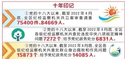 數(shù)據(jù)顯示,黨的十八大以來,截至2022年8月底,全區(qū)紀檢監(jiān)察機關立案審查調(diào)查75400件、84669人,做到有腐必反、除惡務盡,推動政治生態(tài)持續(xù)向上向好。