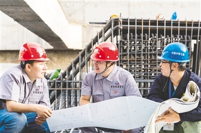 韓佳彤(中)在施工現(xiàn)場為團隊人員指導(dǎo)工作。