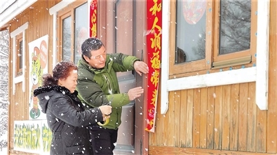 彭成良巡護回來,天上飄起了雪花。夫妻倆一起貼春聯、窗花,掛燈籠,凍冰燈。嶄新的木屋,紅紅的燈籠,醒目的春聯,五彩的冰燈……被裝扮一新的管護站瞬間年味兒十足。為了讓春節(jié)更有儀式感,二人決定再堆兩個雪人。