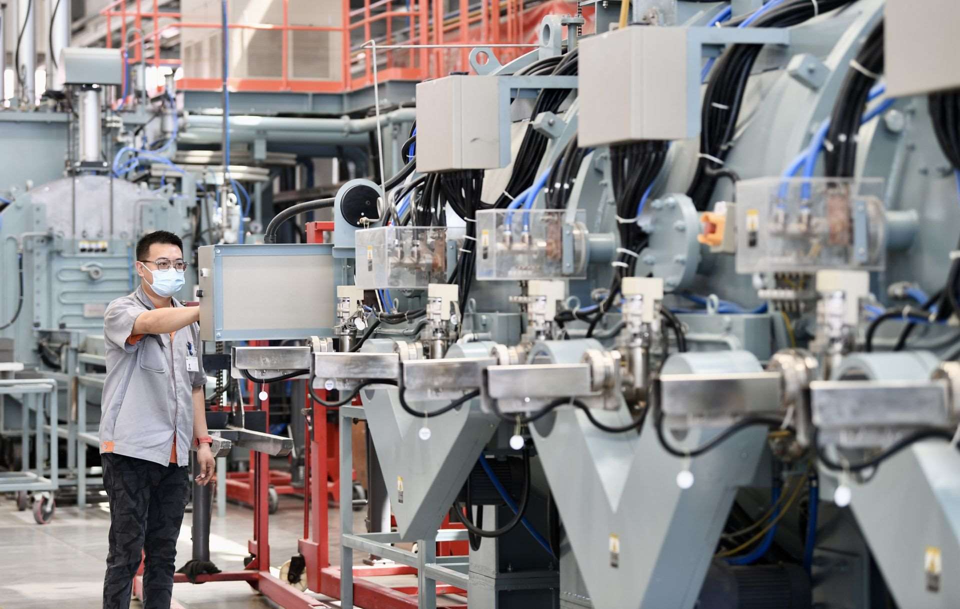 在包頭市稀土高新區(qū)大地熊(包頭)永磁科技有限公司生產(chǎn)車間內(nèi),技術人員查看設備運行情況。