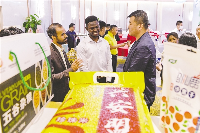 4月12日,第三屆中國國際消費(fèi)品博覽會(huì)國外參展商詳細(xì)了解內(nèi)蒙古興安盟綠色有機(jī)農(nóng)畜產(chǎn)品。消博會(huì)期間,“內(nèi)蒙古·興安盟投資貿(mào)易”推介會(huì)在海南省海口市舉行。推介會(huì)現(xiàn)場促成參會(huì)企業(yè)簽約項(xiàng)目9個(gè),預(yù)計(jì)合作投資額近12億元。作為國家重要的農(nóng)畜產(chǎn)品生產(chǎn)基地,來自內(nèi)蒙古的優(yōu)勢(shì)特色農(nóng)畜產(chǎn)品正走出中國賣向全球。(內(nèi)蒙古日?qǐng)?bào)社融媒體記者 王曉博 攝)