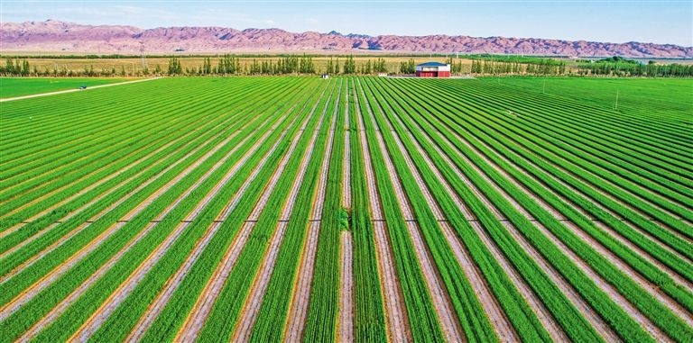 從空中俯瞰,現(xiàn)代農(nóng)業(yè)示范園區(qū)內(nèi),萬畝大田宛如一塊綠色的巨型“畫布”。