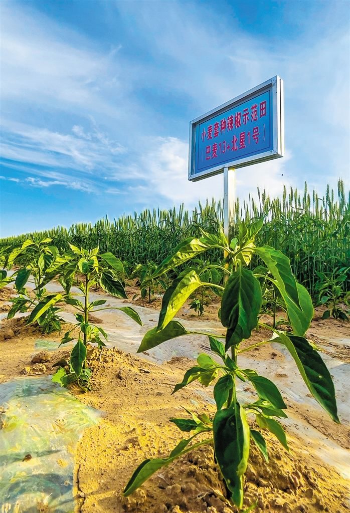 在示范園區(qū)小麥套種辣椒試驗田,目之所及,一排排結(jié)滿麥穗的小麥和長勢正旺的辣椒錯落有致,生機(jī)盎然。