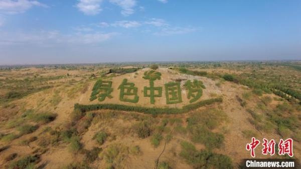 圖為寫有“綠色中國(guó)夢(mèng)”字樣的庫(kù)布其沙漠。 張博供圖