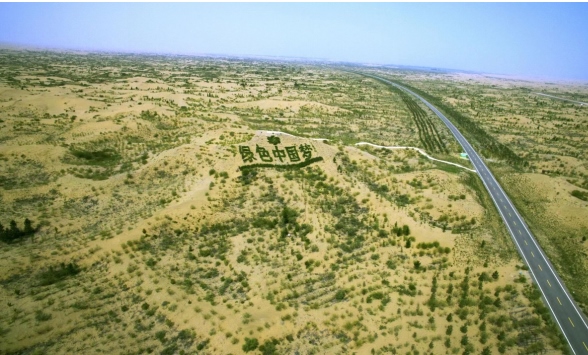 億利庫布其沙峰綠谷生態(tài)區(qū),由5600棵沙地柏種下的“綠色中國(guó)夢(mèng)”五個(gè)大字耀眼醒目。