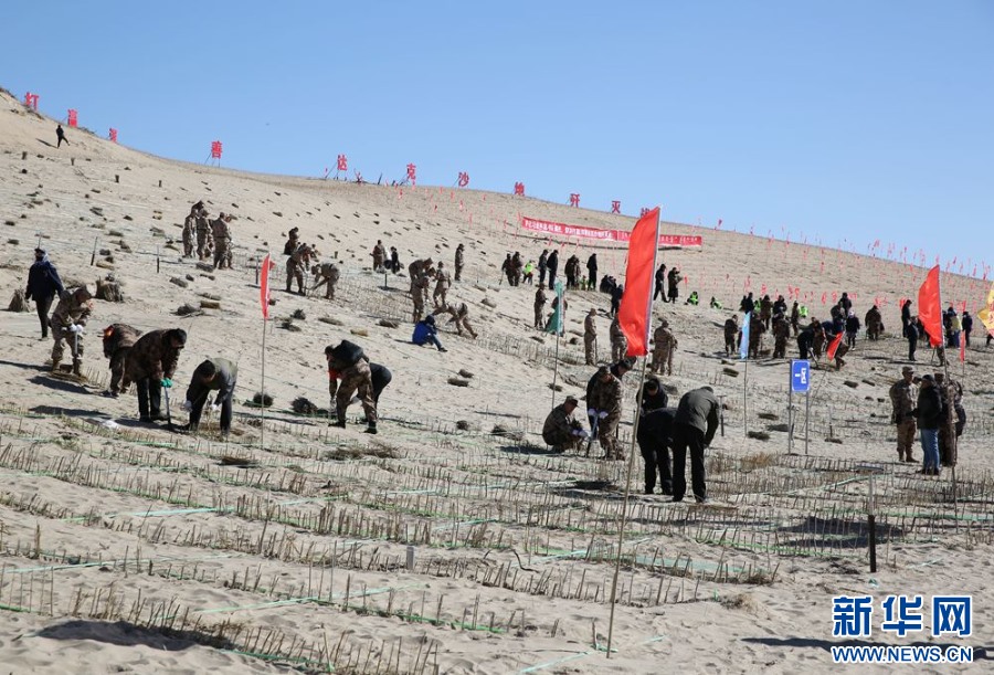 ??參會人員與專業(yè)技術服務隊以及社會各界代表,在渾善達克沙地設置沙障。新華網(wǎng) 石毅攝