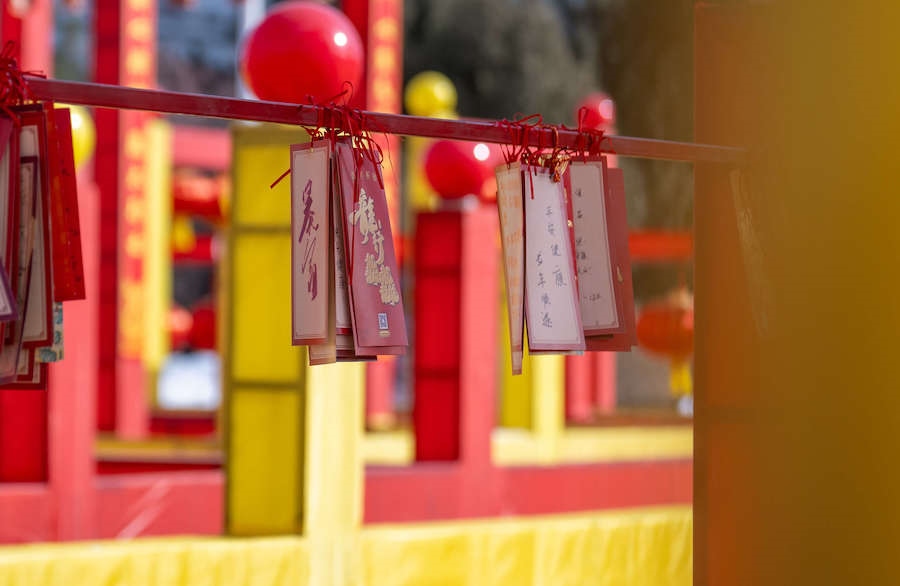 在九曲中,有九道門,其中八道門可以猜燈謎,猜對后換一張祈??▉淼郊殚T進(jìn)行許愿祈福。