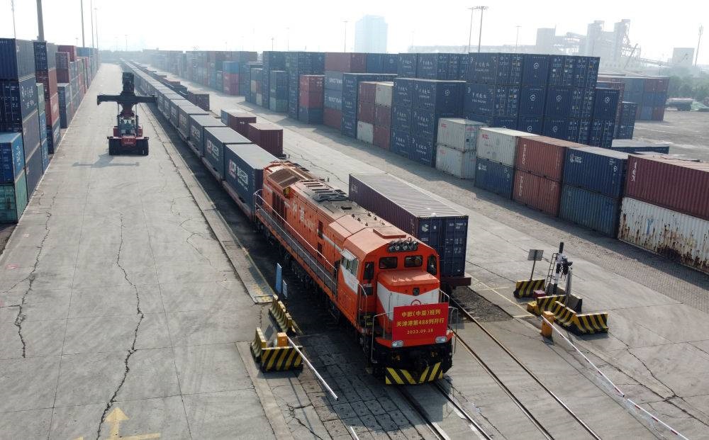 2023年9月18日,一列發(fā)往蒙古國烏蘭巴托的中歐(中亞)班列駛出天津港物捷三堆場(chǎng)(無人機(jī)照片)。