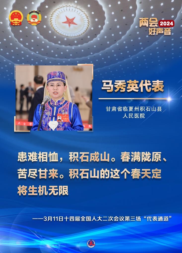 11日下午,十四屆全國人大二次會議第三場“代表通道”在人民大會堂中央大廳北側(cè)舉行。扎根基層、微光如炬,6位全國人大代表分享一線故事,一句句真摯的話語,凝聚成奮進的旋律,在春日里回響。