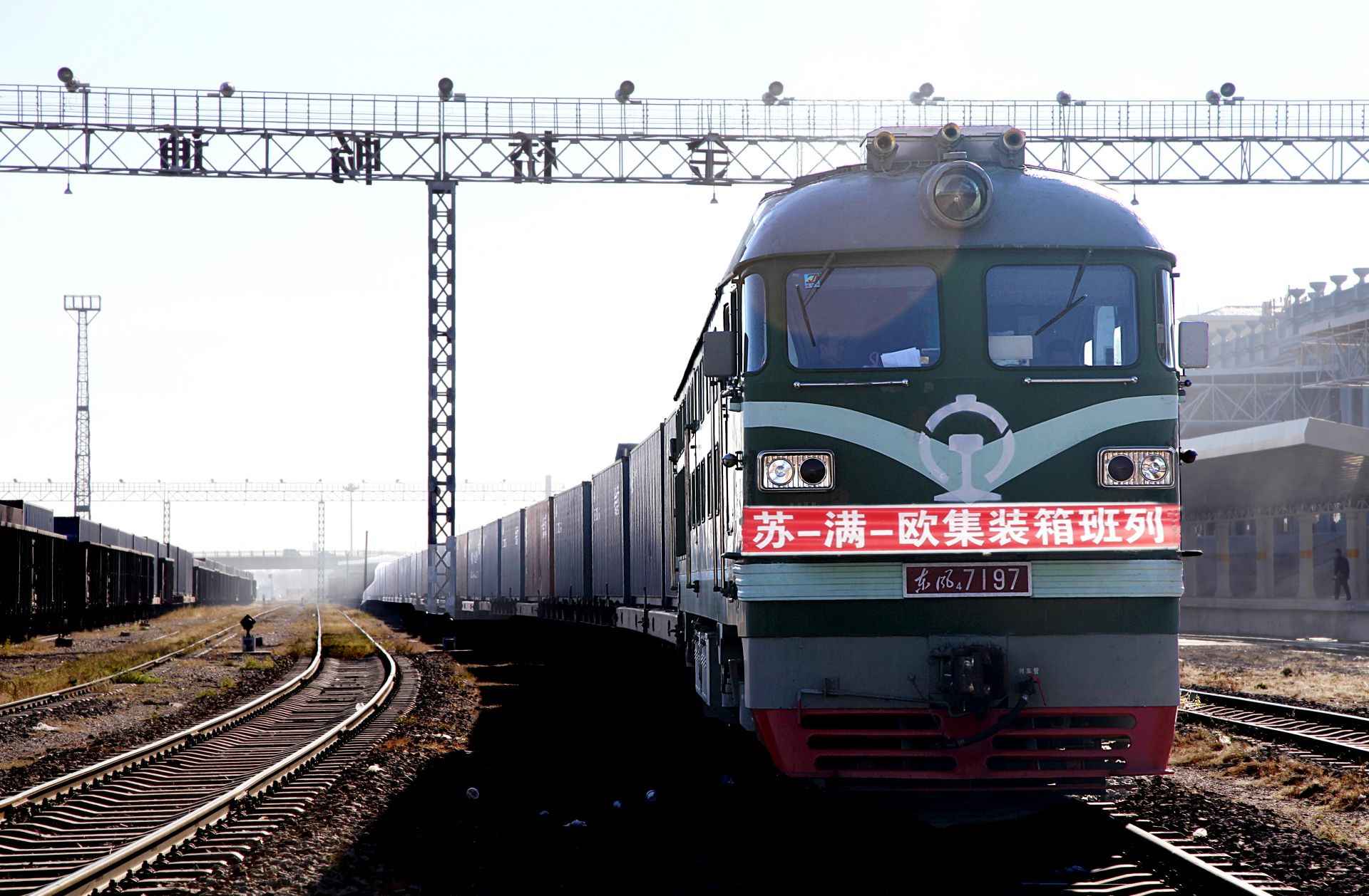 蘇-滿(mǎn)-歐集裝箱班列在滿(mǎn)洲里換裝。李新軍攝