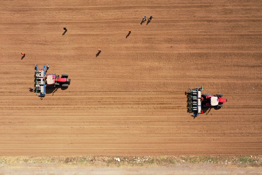 空中俯瞰自動導(dǎo)航無人駕駛農(nóng)機(jī)具 北疆新聞記者 張楊攝影