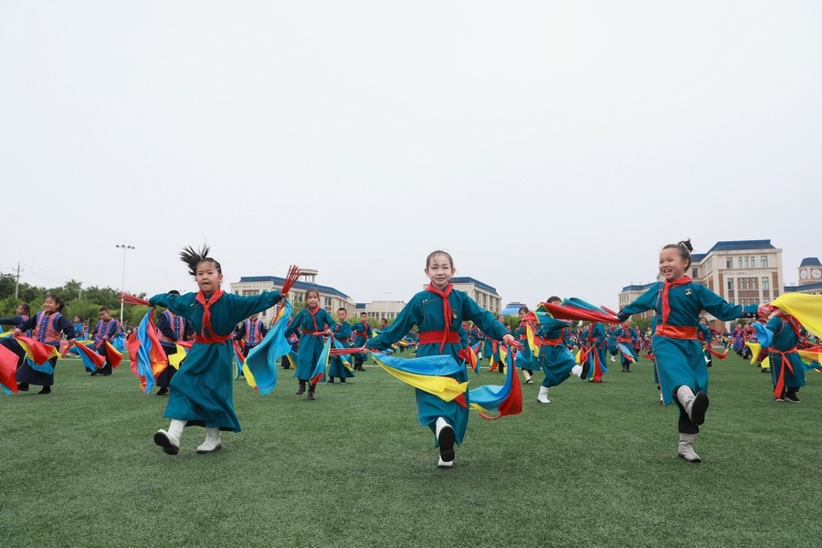 北疆新聞鄂爾多斯5月29日電(記者 張楊)“我們以鑄牢中華民族共同體意識為主線,創(chuàng)建了4個‘千人文化’特色課程,分別為千人足球、千人《江格爾》、千人筷子舞、千人棋類。”5月29日,內(nèi)蒙古鄂爾多斯鄂托克前旗“美育潤心·筑夢同行”第十四屆中小學(xué)師生藝術(shù)節(jié)暨慶“六一”國際兒童節(jié)多彩大課間操展示活動,在鄂托克前旗第一小學(xué)舉行。該校校長阿拉騰達(dá)來接受記者采訪時表示,創(chuàng)建這個特色課程的主要目的,是培養(yǎng)孩子多方面的才藝,為祖國培養(yǎng)有用之才。