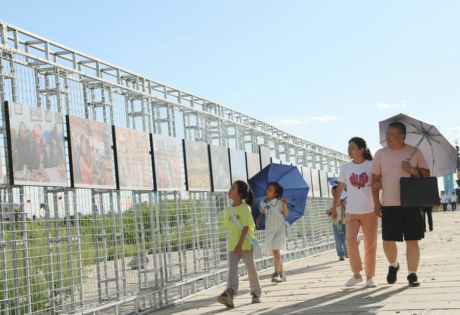 7月28日,第14屆《食色世界》攝影大展,在四子王旗格根塔拉草原旅游中心開(kāi)展。圖為游客從攝影展前走過(guò)。