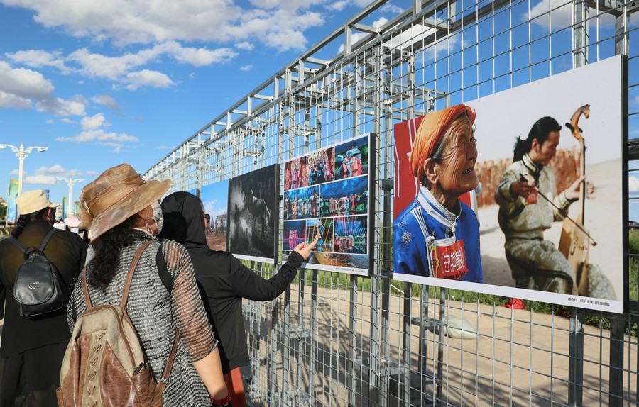 7月28日,第14屆《食色世界》攝影大展,在四子王旗格根塔拉草原旅游中心開(kāi)展。圖為游客正在參觀攝影展。