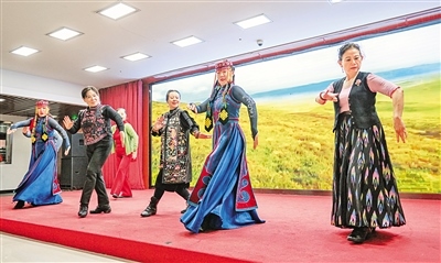 11月12日,烏蘭牧騎隊員在北京市西城區(qū)德勝街道辦事處與群眾一同跳舞。當日,內(nèi)蒙古自治區(qū)直屬烏蘭牧騎攜包頭市達茂旗烏蘭牧騎、鄂爾多斯市伊金霍洛旗烏蘭牧騎開展“紅色文藝輕騎兵 烏蘭牧騎在北京”——北疆文化神州行文藝演出活動。據(jù)了解,此次烏蘭牧騎進京演出活動,從11月6日至17日,在北京的民族文化宮為觀眾奉獻33場精彩的演出,同時還將走進社區(qū)和學校開展多場演出活動。 (記者 王磊 攝)