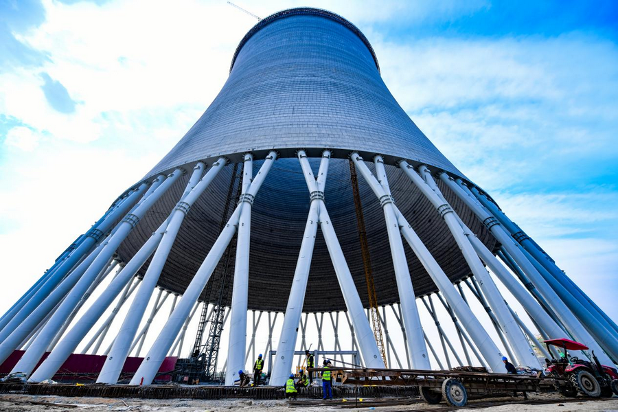 12月6日,在內(nèi)蒙古呼和浩特市土默特左旗內(nèi)蒙古能源集團(tuán)金山熱電三期項(xiàng)目建設(shè)現(xiàn)場,工人們正有序進(jìn)行著設(shè)備安裝等工作。進(jìn)入該項(xiàng)目間冷塔內(nèi)部,抬頭仰望,仿佛一只巨大的眼睛凝視,未來該項(xiàng)目投產(chǎn)后可實(shí)現(xiàn)年發(fā)電量100億千瓦時,新增供熱面積5000萬平方米,將溫暖送至千家萬戶。(楊鑫 攝)
