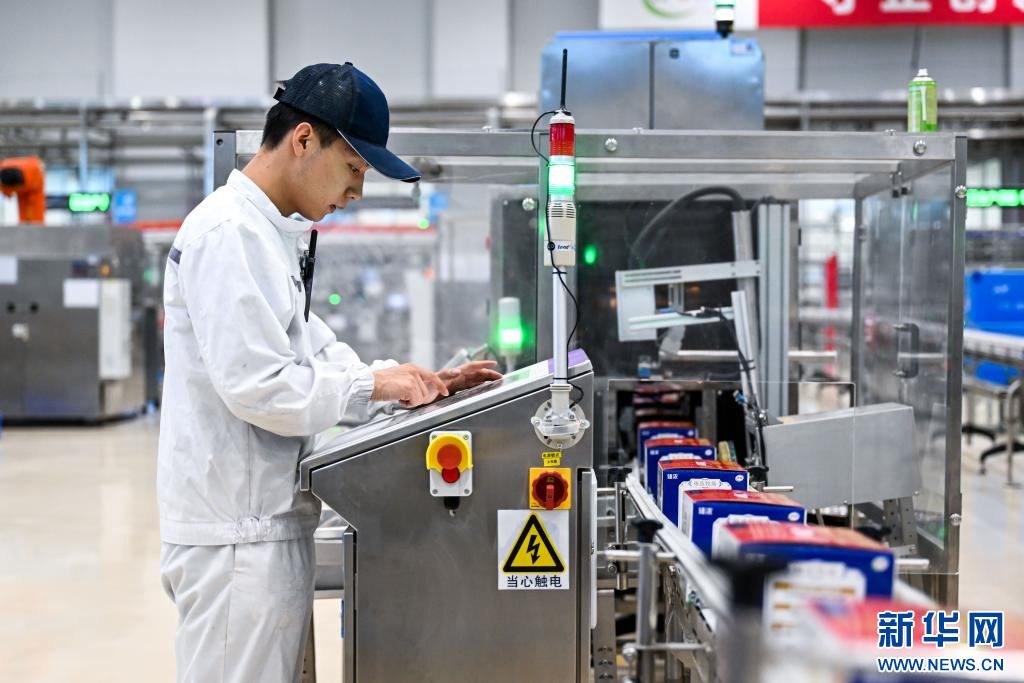 1月9日,在呼和浩特市伊利現代智慧健康谷液態(tài)奶全球智造標桿基地,工人在生產線上操作設備。