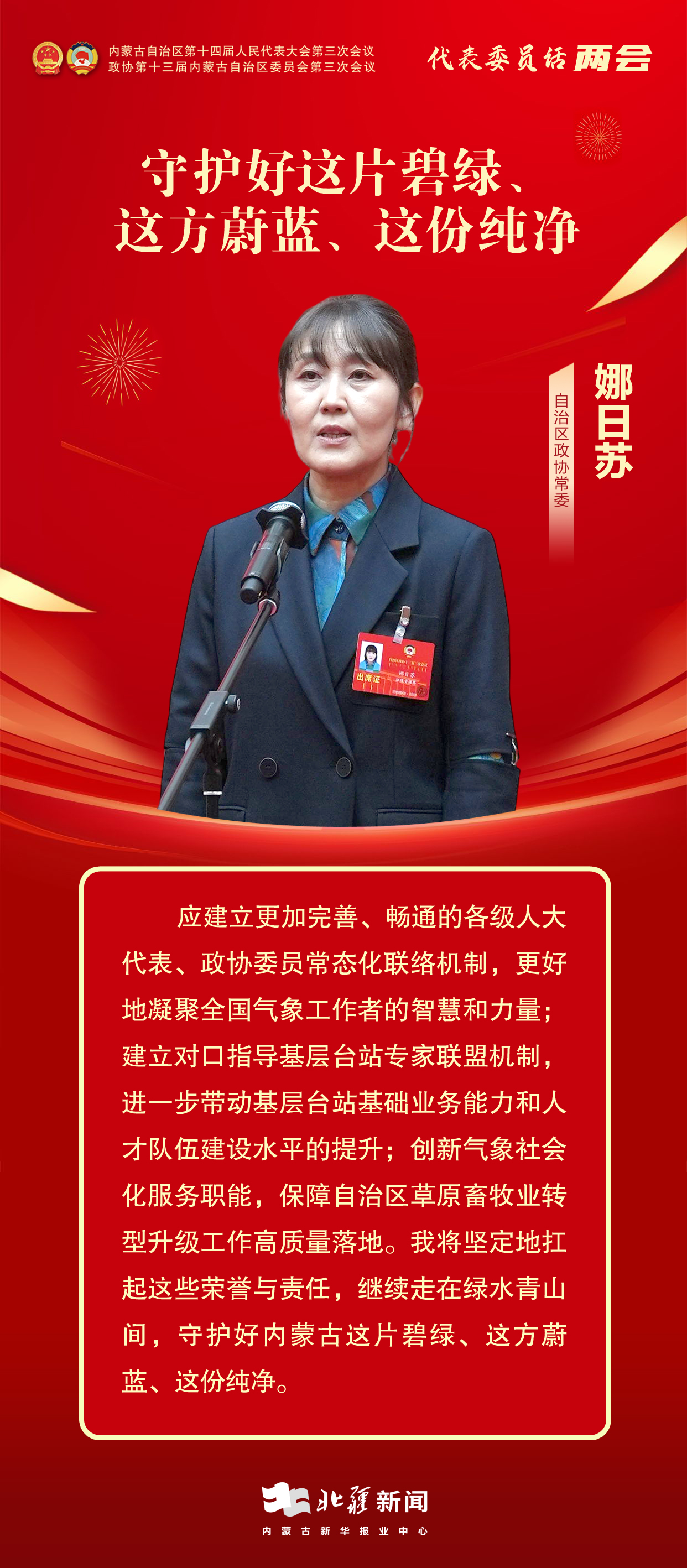 娜日蘇表示,她將堅(jiān)定地扛起這些榮譽(yù)與責(zé)任,繼續(xù)走在綠水青山間,守護(hù)好內(nèi)蒙古這片碧綠、這方蔚藍(lán)、這份純凈。