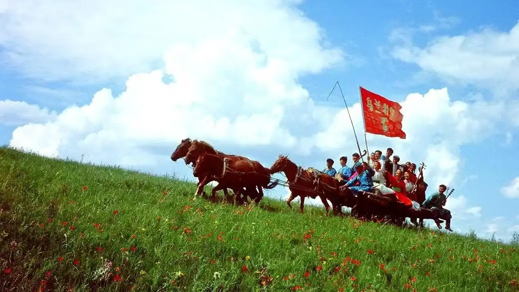 1957年6月17日,內(nèi)蒙古第一支烏蘭牧騎在錫林郭勒盟蘇尼特右旗成立。成立第二天,9名隊員帶著兩塊幕布、三盞煤油燈、五件樂器,舉著紅旗,甩著響鞭,坐著馬車,向偏遠的牧區(qū)進發(fā)。