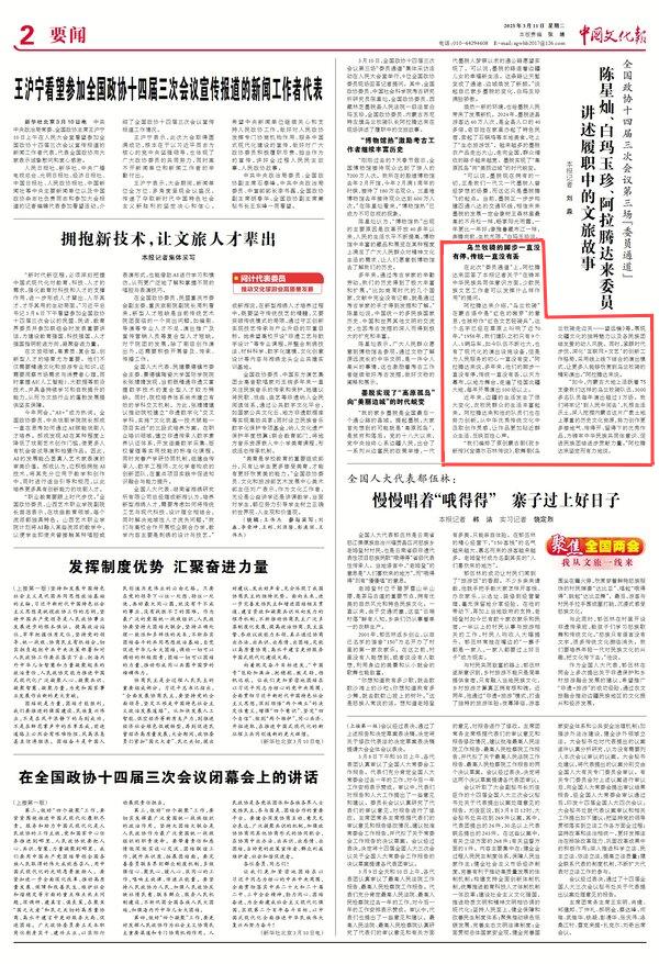 2025年3月11日,《中國文化報》第2版刊發(fā)了《烏蘭牧騎的腳步一直沒有停,傳統(tǒng)一直沒有丟》的文章,報道了3月10日,全國政協(xié)十四屆三次會議第三場“委員通道”集體采訪活動在人民大會堂舉行,其中,全國政協(xié)委員、內(nèi)蒙古蘇尼特左旗烏蘭牧騎隊長阿拉騰達來在現(xiàn)場講述了履職中的文旅故事。