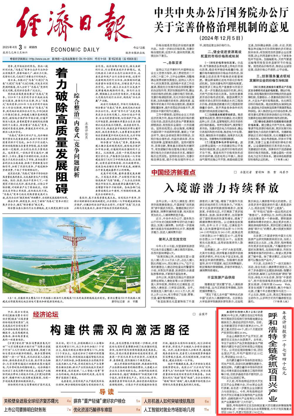 2025年4月3日,《經(jīng)濟(jì)日?qǐng)?bào)》第1版刊發(fā)題為《年度計(jì)劃投資一千七百四十億元 呼和浩特全鏈條抓項(xiàng)目興產(chǎn)業(yè)》的文章,報(bào)道了今年以來(lái),內(nèi)蒙古自治區(qū)呼和浩特市圍繞項(xiàng)目招商引資和落地建設(shè)全鏈條發(fā)力,推動(dòng)經(jīng)濟(jì)回升向好。
