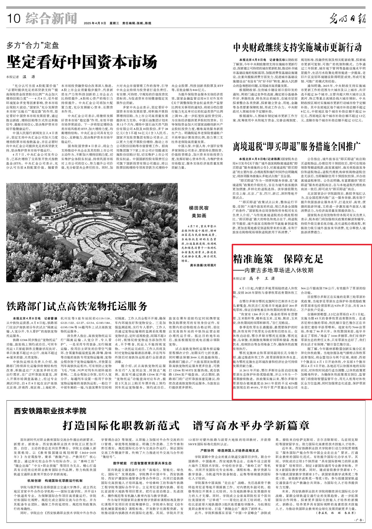 2025年4月9日,《光明日報》第10版刊發(fā)題為《精準(zhǔn)施策 保障充足——內(nèi)蒙古多地草場進入休牧期》的文章,報道了4月1日起,內(nèi)蒙古多地草場陸續(xù)進入休牧期,安排2025年禁牧與春季牧草返青期休牧工作。