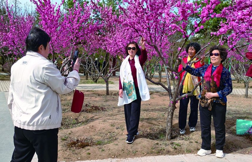 走進(jìn)植物園,道路兩側(cè)的榆葉梅競相綻放,粉紅色的花朵層層疊疊掛滿枝頭,形成一片爛漫花海。從浙江來的游客李筱正用手機記錄美景:“原本擔(dān)心錯過北方花期,沒想到這里的榆葉梅開得這么漂亮,完全不輸江南的春天。”
