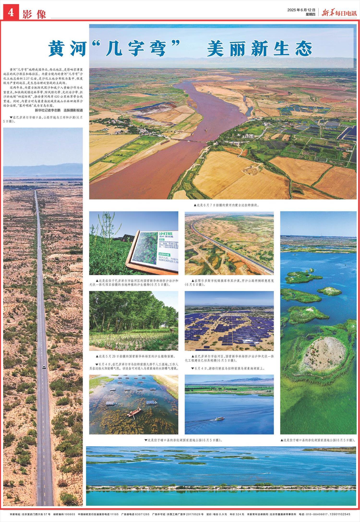 2025年6月12日,《新華每日電訊》第4版刊發(fā)題為《黃河“幾字彎” 美麗新生態(tài)》一文,報道了黃河“幾字彎”地跨我國華北、西北地區(qū),是影響京津冀地區(qū)的風沙源區(qū)和路徑區(qū)。內蒙古加快構筑鎖邊林草帶、防風綠化帶、光伏治沙帶、攔沙淤地壩“四道防線”,推動黃河兩岸620公里林草帶全線貫通。