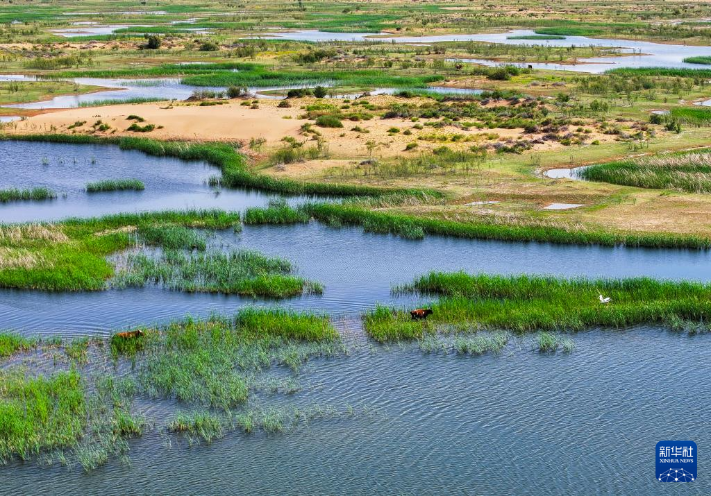 這是位于巴彥淖爾市磴口縣的奈倫湖國家濕地公園(6月5日攝,無人機照片)新華社記者 連振 攝