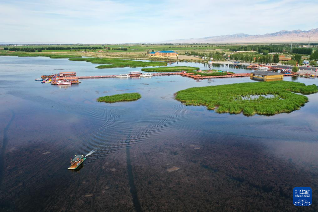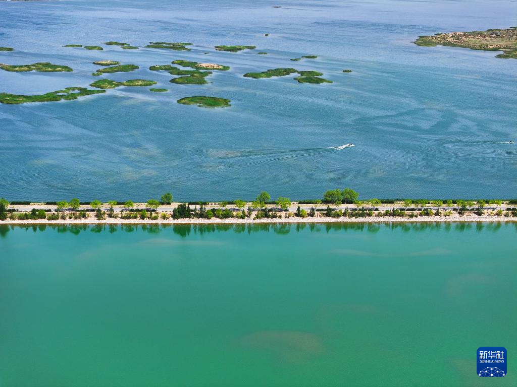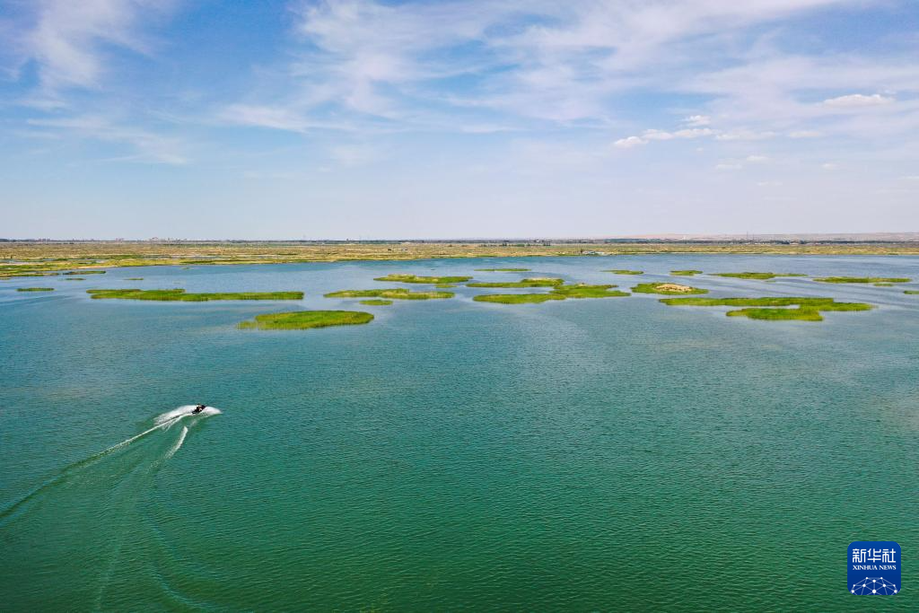 6月5日,在巴彥淖爾市磴口縣奈倫湖國家濕地公園,摩托艇行駛在湖面上(無人機照片)新華社記者 李志鵬 攝