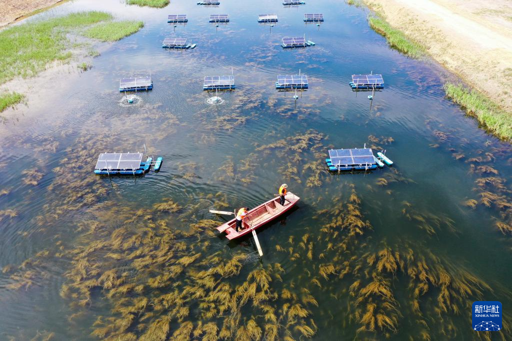 6月4日,在烏拉特前旗九排干人工濕地,工作人員在巡檢太陽能曝氣機。該設備可對進入烏梁素海的水體曝氣增氧(無人機照片)新華社記者 李志鵬 攝