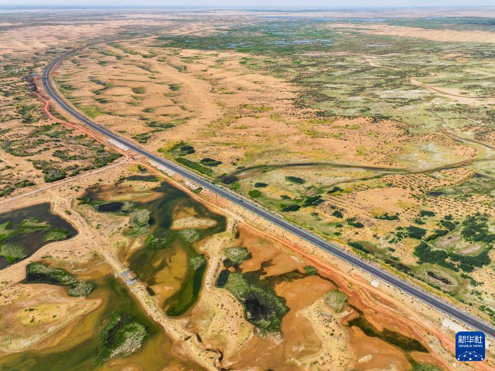 在鄂爾多斯市杭錦旗庫布其沙漠,穿沙公路兩側綠意蔥蘢(6月6日攝,無人機照片)新華社記者 連振 攝