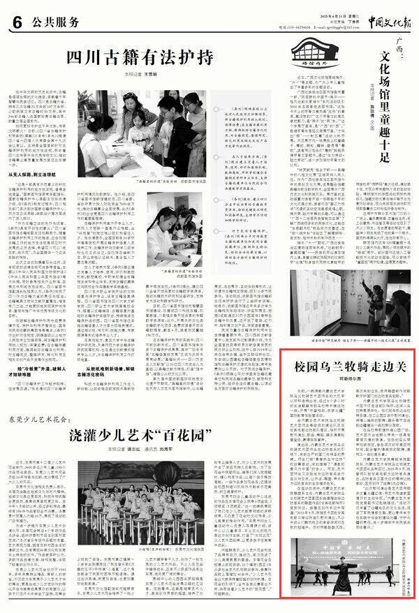 2025年6月11日,《中國文化報》第6版刊發(fā)題為《校園烏蘭牧騎走邊關》的文章,報道了內蒙古藝術學院烏蘭牧騎藝術團師生來到烏拉特中旗邊防一線,開展慰問演出,歌曲、舞蹈、器樂演奏輪番登場,贏得陣陣掌聲。