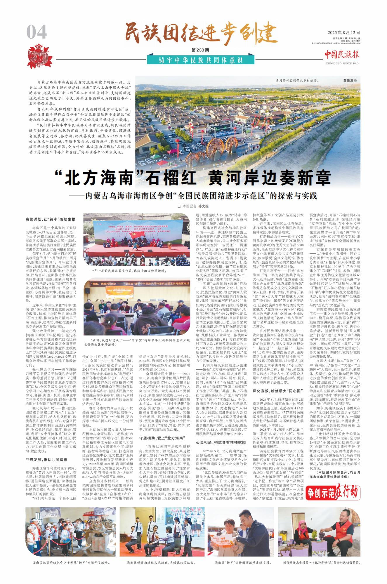 2025年8月12日,《中國民族報》第4版刊發(fā)整版文章《“北方海南”石榴紅 黃河岸邊奏新章——內(nèi)蒙古烏海市海南區(qū)爭創(chuàng)“全國民族團結進步示范區(qū)”的探索與實踐》,報道了自2018年成功創(chuàng)建“自治區(qū)民族團結進步示范區(qū)”后,內(nèi)蒙古烏海市海南區(qū)各族干部群眾在爭創(chuàng)“全國民族團結進步示范區(qū)”的新征程上凝心聚力再出發(fā),共同唱響民族團結進步主旋律。