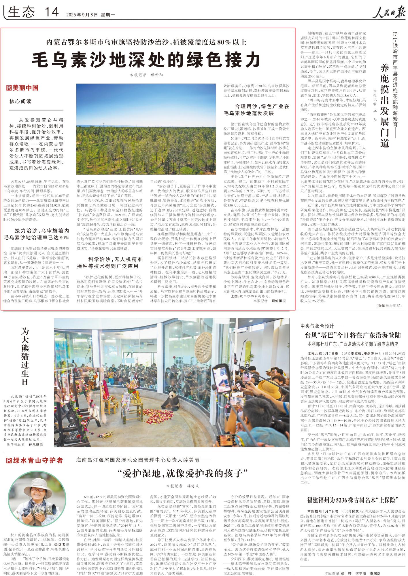2025年9月8日《人民日報(bào)》第14版刊發(fā)了《內(nèi)蒙古鄂爾多斯市烏審旗堅(jiān)持防沙治沙,植被覆蓋度達(dá)80%以上 毛烏素沙地深處的綠色接力》的文章,報(bào)道了在內(nèi)蒙古鄂爾多斯市烏審旗,一代代治沙人不斷鞏固拓展治理成果,書寫著沙海變綠洲、荒漠成良田的動人故事。沙地林果、沙地中藥材、生態(tài)農(nóng)業(yè)、生態(tài)旅游等綠色產(chǎn)業(yè)正在廣袤的毛烏素沙地上蓬勃發(fā)展,煥發(fā)出綠水青山就是金山銀山的勃勃生機(jī)。