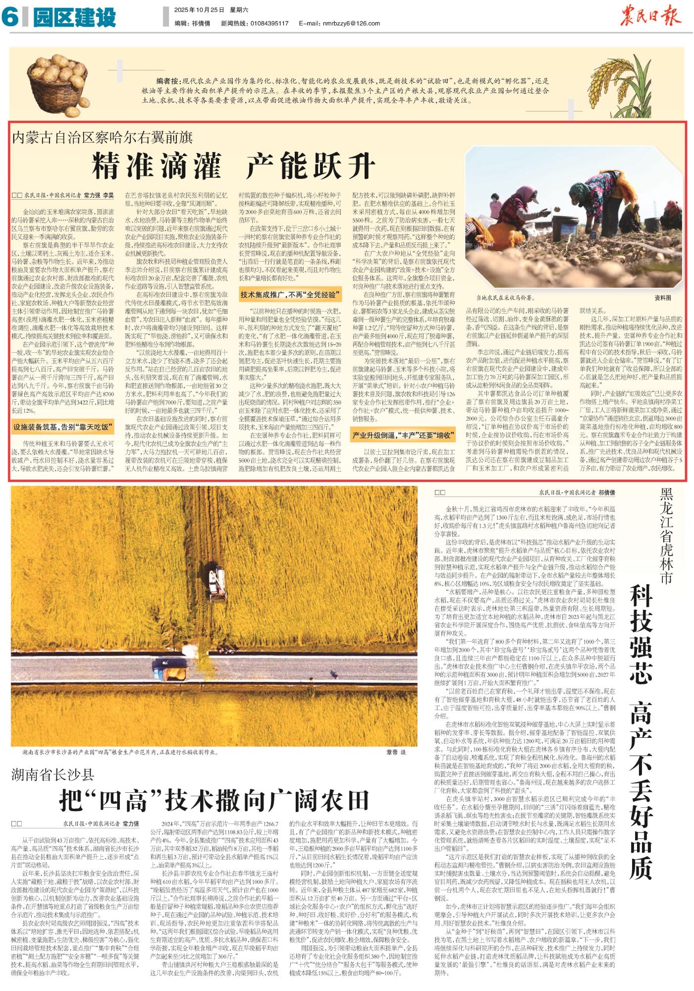 2025年10月25日,《農(nóng)民日報》第6版刊發(fā)題為《內(nèi)蒙古自治區(qū)察哈爾右翼前旗:精準滴灌 產(chǎn)能躍升》的文章,報道了內(nèi)蒙古烏蘭察布市察哈爾右翼前旗通過現(xiàn)代農(nóng)業(yè)產(chǎn)業(yè)園推廣滴灌水肥一體化等技術(shù),推動玉米、馬鈴薯單產(chǎn)大幅提升,成功實現(xiàn)從“靠天吃飯”到科技增收的轉(zhuǎn)變。