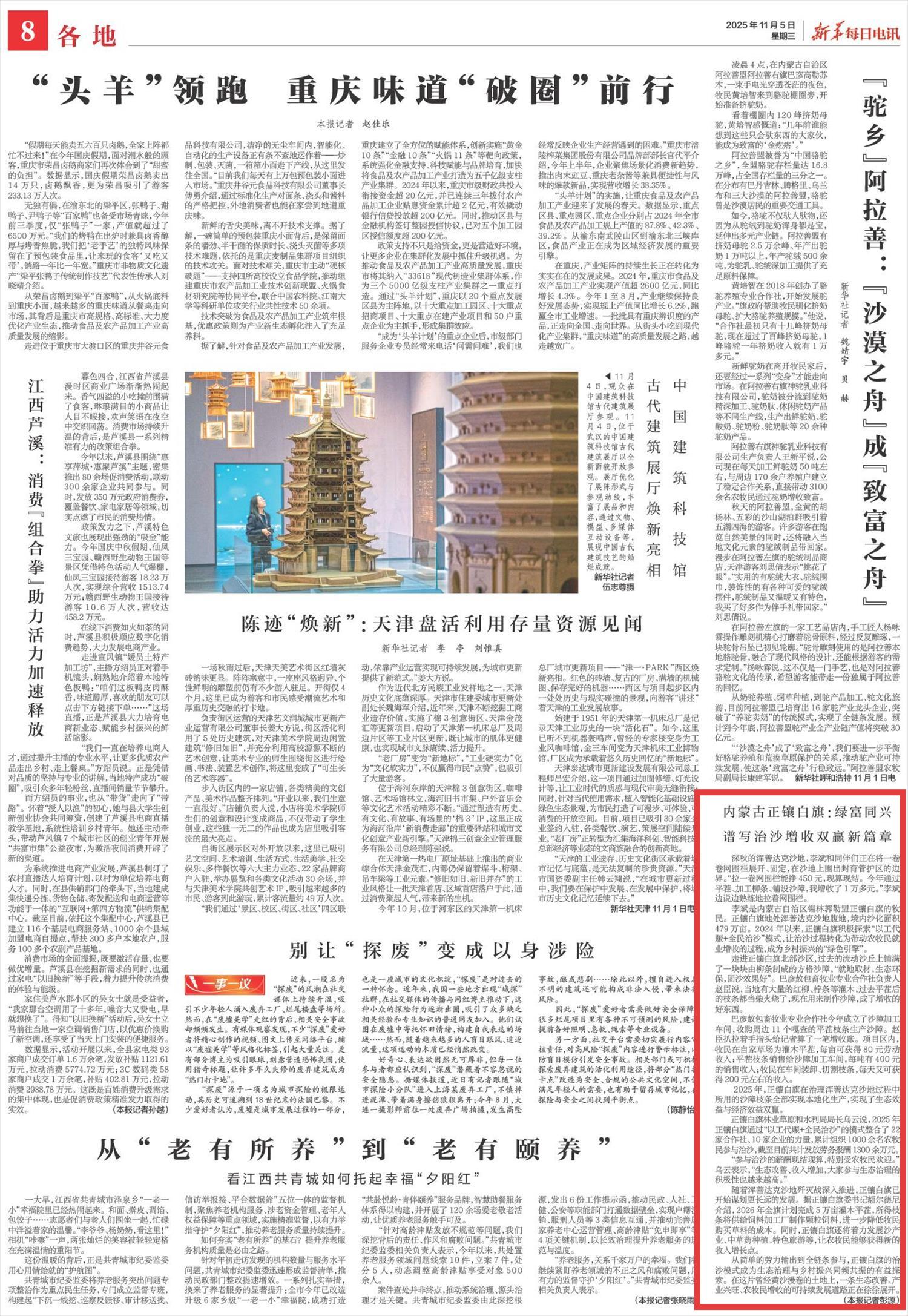 2025年11月5日,《新華每日電訊》第8版刊發(fā)題為《內蒙古正鑲白旗:綠富同興譜寫治沙增收雙贏新篇章》的文章,報道了2024年以來,內蒙古正鑲白旗積極探索“以工代賑+全民治沙”模式,讓治沙過程轉化為帶動農牧民就業(yè)增收的過程,成為鄉(xiāng)村振興的“綠色引擎”。