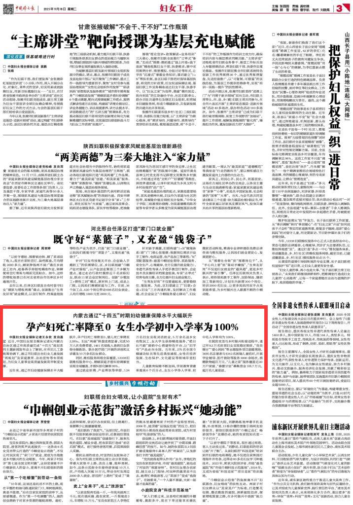 2025年11月18日《中國婦女報》第3版刊發(fā)了《內(nèi)蒙古通遼“十四五”時期婦幼健康保障水平大幅躍升 孕產(chǎn)婦死亡率降至0 女生小學(xué)初中入學(xué)率為100%》的文章,報道了近年來,通遼市婦幼健康保障水平大幅躍升,孕產(chǎn)婦死亡率降至0,嬰兒死亡率降至2.28‰。婦女“兩癌”篩查成效顯著,完成50萬人次免費篩查,1461名低收入患病婦女獲得全額救助。聯(lián)合醫(yī)療部門開展的講座和義診惠及10萬余名婦女群眾。