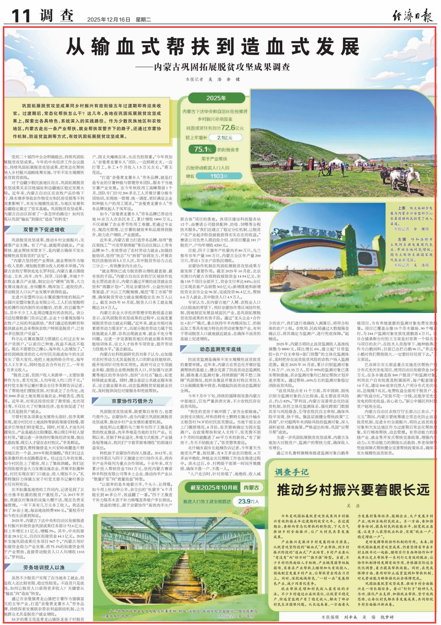 2025年12月16日,《經(jīng)濟日報》第11版刊發(fā)題為《從輸血式幫扶到造血式發(fā)展——內(nèi)蒙古鞏固拓展脫貧攻堅成果調(diào)查》的文章,報道了鞏固拓展脫貧攻堅成果同鄉(xiāng)村振興有效銜接五年過渡期即將迎來收官。作為少數(shù)民族地區(qū)和農(nóng)牧地區(qū),內(nèi)蒙古走出一條產(chǎn)業(yè)幫扶、就業(yè)幫扶雙管齊下的路子,還通過京蒙協(xié)作機制、防返貧監(jiān)測等方式,有效鞏固拓展脫貧攻堅成果。
