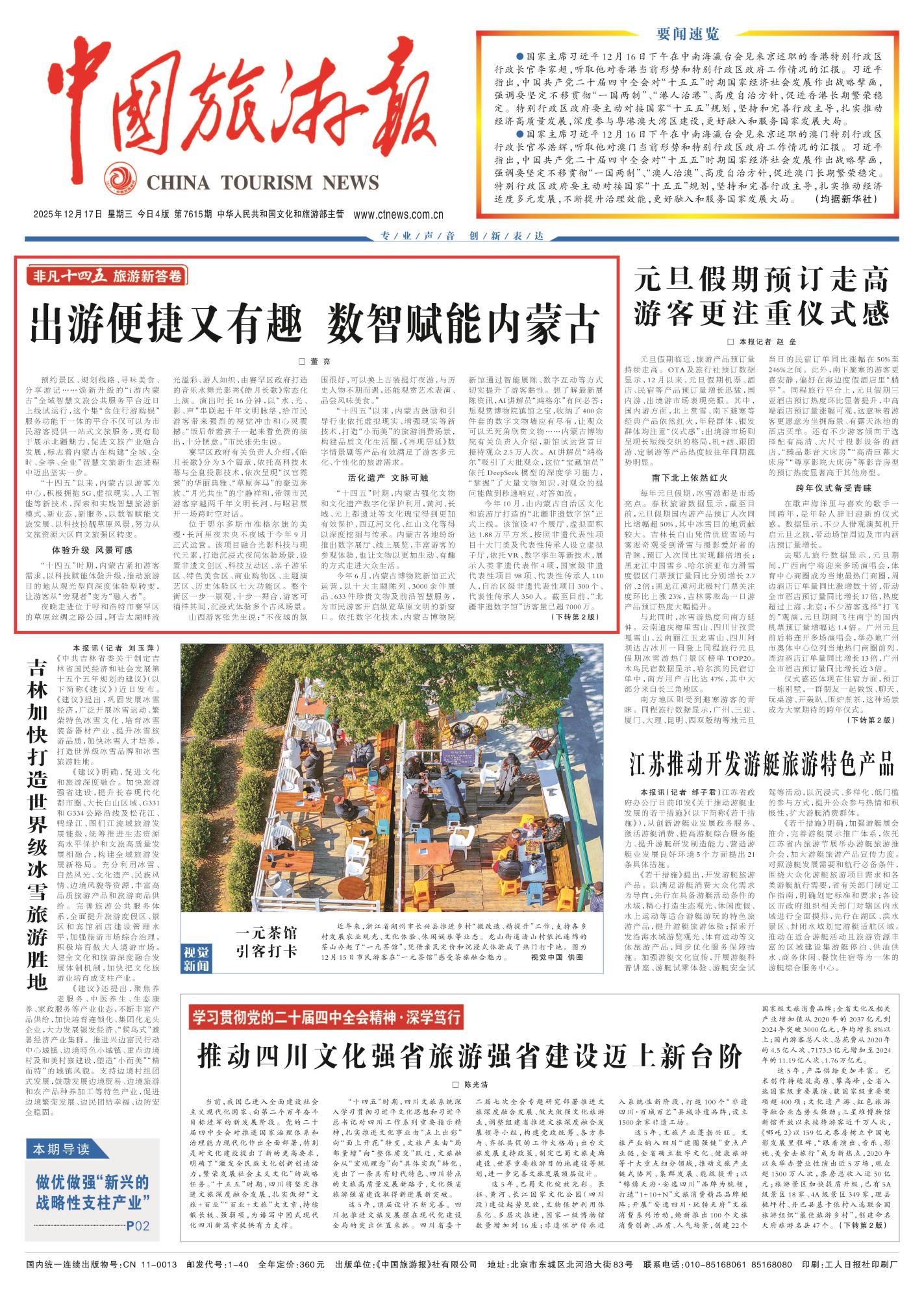 2025年12月17日《中國旅游報》第1版刊發(fā)了題為《593件旅游商品獲內(nèi)蒙古品牌標識授權(quán)》的文章,報道了內(nèi)蒙古全域智慧文旅公共服務(wù)平臺“i游內(nèi)蒙古”近日上線試運行,這個集“食住行游購娛”服務(wù)功能于一體的平臺不僅可以為市民游客提供一站式文旅服務(wù),更標志著內(nèi)蒙古在構(gòu)建“全域、全時、全季、全業(yè)”智慧文旅新生態(tài)進程中邁出堅實一步。