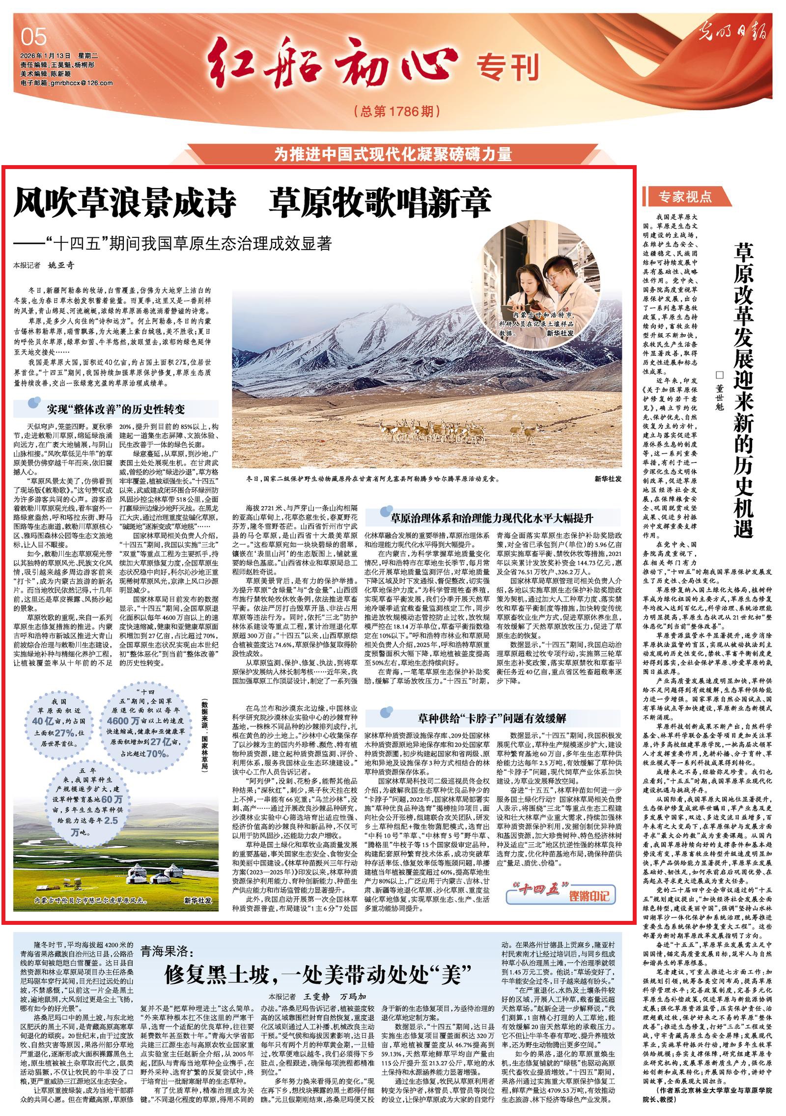 2026年1月13日,《光明日報(bào)》5版刊發(fā)題為《風(fēng)吹草浪景成詩 草原牧歌唱新章——“十四五”期間我國草原生態(tài)治理成效顯著》的文章,報(bào)道了“十四五”期間,我國持續(xù)加強(qiáng)草原保護(hù)修復(fù),草原生態(tài)質(zhì)量持續(xù)改善,交出一張綠意充盈的草原治理成績單。