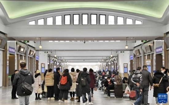北京火車站在保持歷史原貌的前提下對候車大廳的裝飾、燈光等進行了升級改造(2023年2月17日攝)。