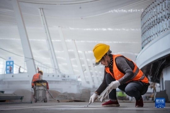 5月1日,在中建三局承建的武漢天河機場T2航站樓改造工程項目工地,工人在進行樓地面施工作業(yè)。