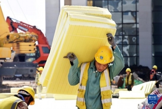5月1日,中建八局四公司的工人在山東省青島市高新區(qū)康復大學項目工地施工。