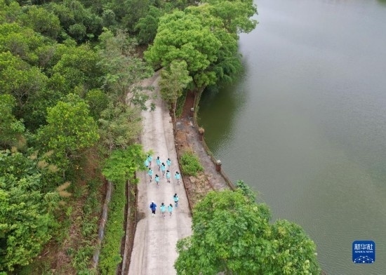 在海南瓊中縣舉辦的中國足協(xié)女足青訓(xùn)中心“希望杯”U12組比賽的空閑時段,四川隊隊員在賓館內(nèi)部道路跑步(無人機(jī)照片,4月10日攝)。