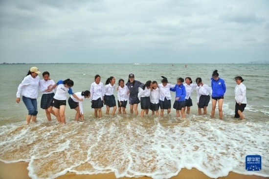 在海南瓊中縣舉辦的中國足協(xié)女足青訓(xùn)中心“希望杯”U12組比賽結(jié)束后,四川隊教練團(tuán)隊帶領(lǐng)隊員在海邊游玩(4月11日攝)。